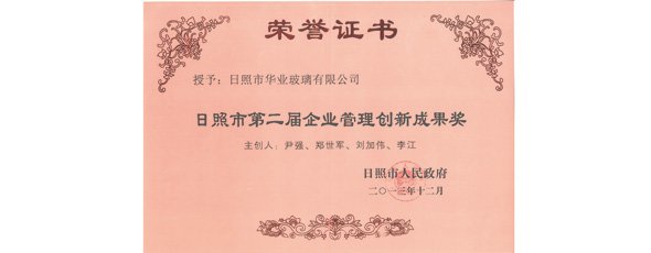 華業(yè)玻璃被日照市人民政府授予“日照市第二屆企業(yè)管理創(chuàng)新成果獎(jiǎng)”